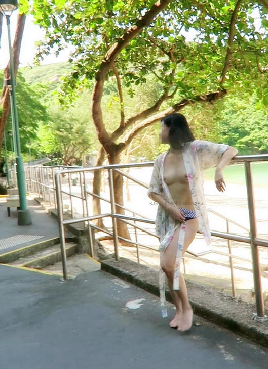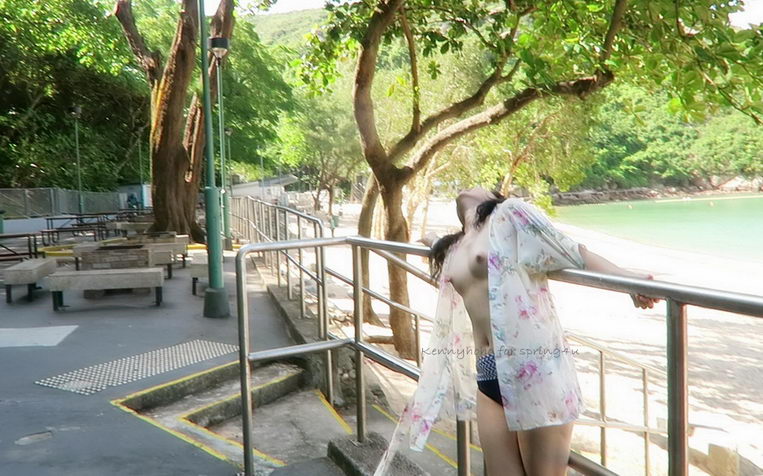 小菲守住沙灘一隅, 感到很安全. 回首幾次, 看見沙灘其他人沒有投來異樣目光, 更放開了, 肯移到臨灘的欄杆, 擺出各種姿勢.  聽到沙灘傳來沙沙之聲, 也不退縮 -- 因為她決定暫時做頭鴕鳥, 相信, "我看不見他們, 他們也會看不到我!" 在拍照的我反而不明白, 為何小菲身後那位掃沙工友, 總留在這一角揮帚?