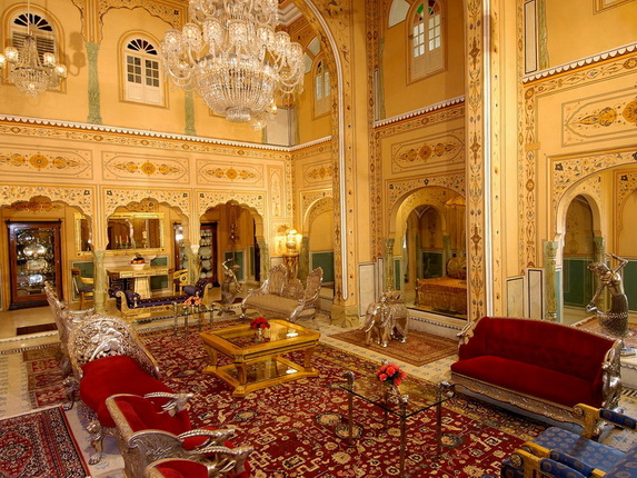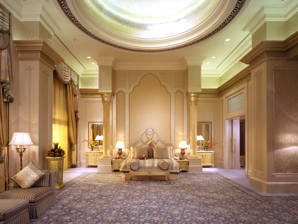 從天花垂下一座豪華的水晶吊燈閃閃發亮。吊燈下就佈置一張可以躺很多人的粉