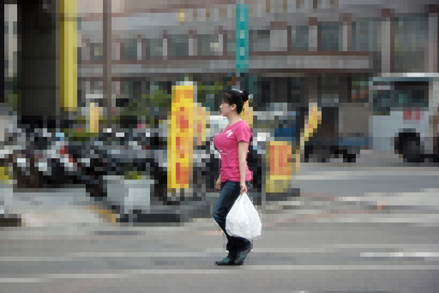 一時失措的女人趕緊用手上提的袋子捂住胸口,她心裡明白,自己的乳房從