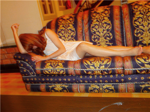 的左手臂擁在胸口,左手在不停地拉著自己性感的短裙,屁股上還留有紅色的腰