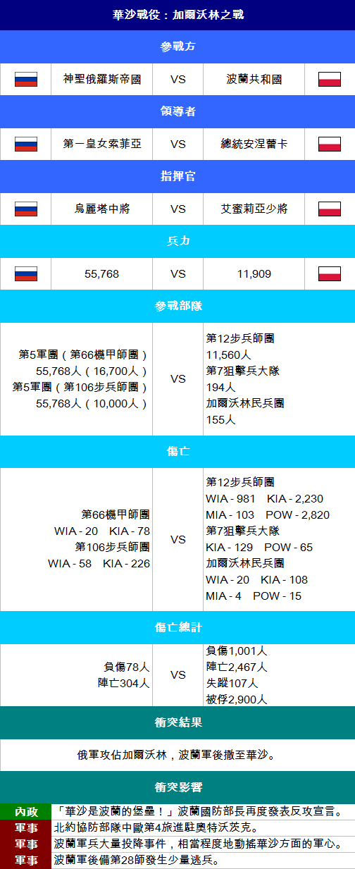 (華沙戰役)加爾沃林之戰:2154.12,謝德爾采失守,俄軍馬不停蹄地進攻波蘭軍於馬佐夫舍的第二防線──加爾沃林。由於波蘭軍主力、北約協防部隊盡往華沙集中,空軍亦保存實力準備首都決戰,本地駐防隊勢單力薄,在俄軍攻勢下迅速潰敗。本次戰事中,波蘭軍包含一個完整的步兵聯隊在內共有兩千餘軍兵放棄任務、投降俄軍,大大地憾動波蘭軍整體士氣。