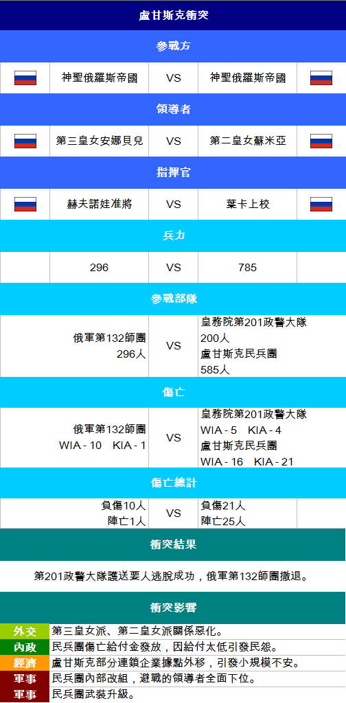 第201政警大隊動向:第201政警大隊的五個任務編隊事先進駐盧甘斯克,尚有機甲團於近郊待命。在探明對方追擊部隊只有步兵後,為免衝突等級升溫,機甲團先行撤離至州境。原本以為憑著皇務院名義得以避開衝突,「沒想到那群婊子竟然直接開槍啊!」最終仍與對方共持且戰且退的方式應戰,以期降低傷亡程度。