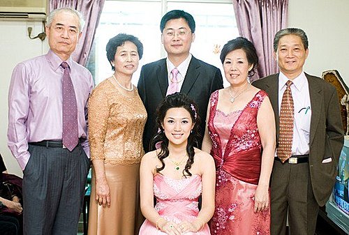 這照片我反覆看了幾次,總感覺…左二跟後面那新郎官是一家子,右二跟新娘子是一家,直接由臉型判定的啦,不知道其他人是否與我有同感,沒辦法呢,從身高來看就切成兩邊了(純臆測)。