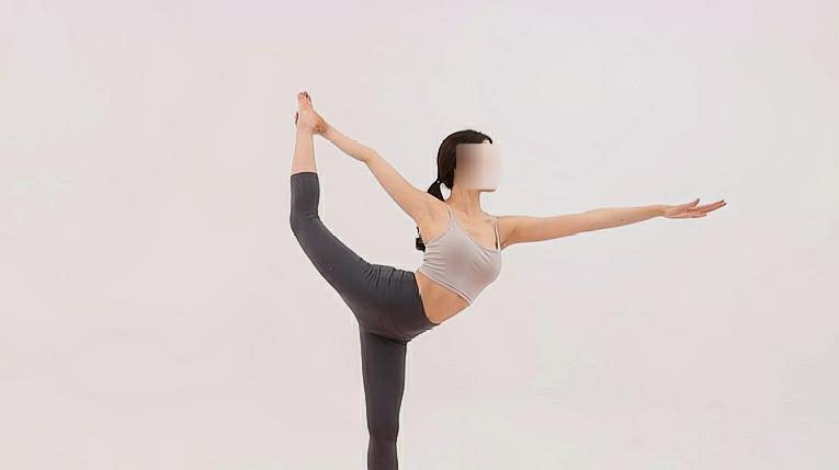 身體前傾,腹部收緊,左腿獨立,大腿欣長、小腿纖細、鎖骨白皙、手臂優美、