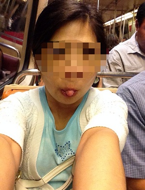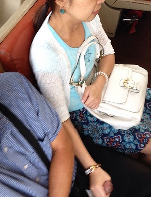 漢子摩蹭著,擠到芬妹旁坐下,芬妹仍渾然不覺,正在列車裡玩自拍。