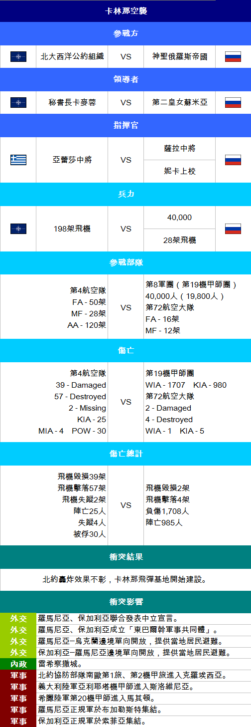 卡林那空襲:2154.12,俄軍進入巴爾幹非戰區域,計劃在羅馬尼亞西南方建立飛彈基地,北約視此舉形同侵門踏戶,主動出擊。俄軍主力停留在雷希察及後方,第19機甲師擔當突出部,佈陣於雷希察─卡林那;北約空軍起用一個航空隊,針對俄軍突出部先後發動五波晝間轟炸、兩波夜間轟炸,然而並未取得決定性戰果。