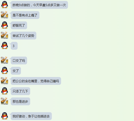 不可否认,每次和她聊天,我都硬硬的!昨天她和公公又做了两次,她彻底放开了,沉迷于公公强大的性能力之中,享受着冲击和一波波快感!附件里是一点聊天记录。