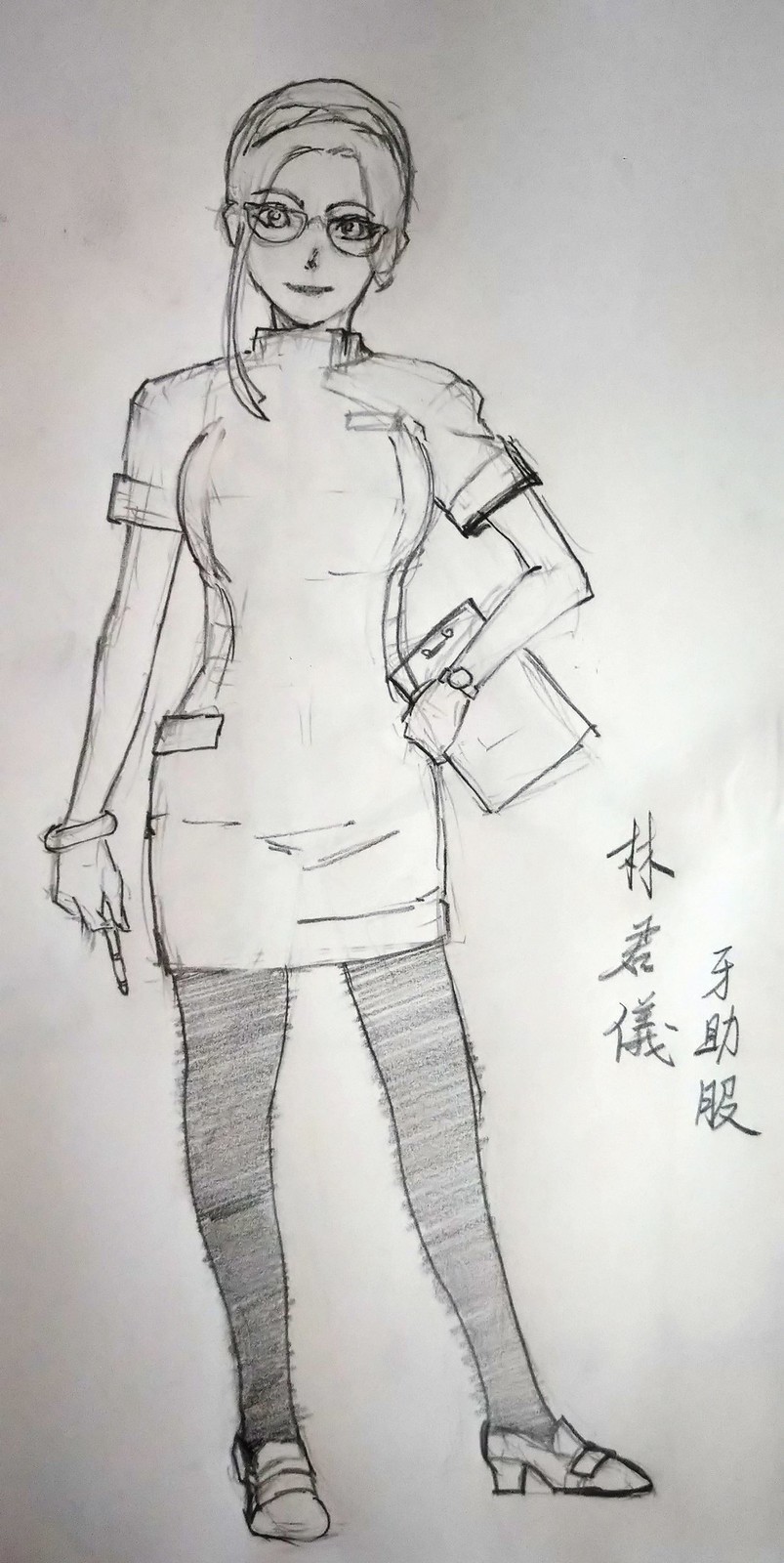 母親穿著一件淡紫色前扣立領七分袖的護士服,不同的是這比常見的護士服質料更薄剪裁更合身窄裙下襬更
