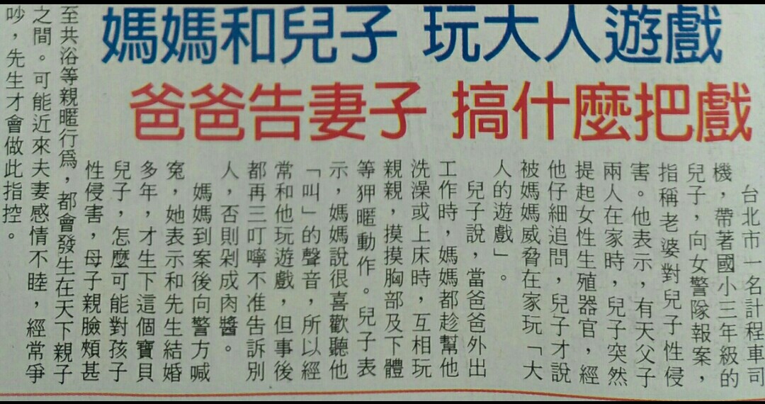 在下看到一篇不錯的報導,可以貼嗎?,大約是報導有關丈夫指控妻子和兒子狹玩的事。