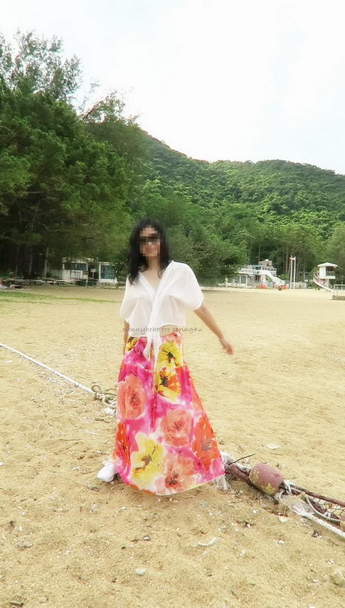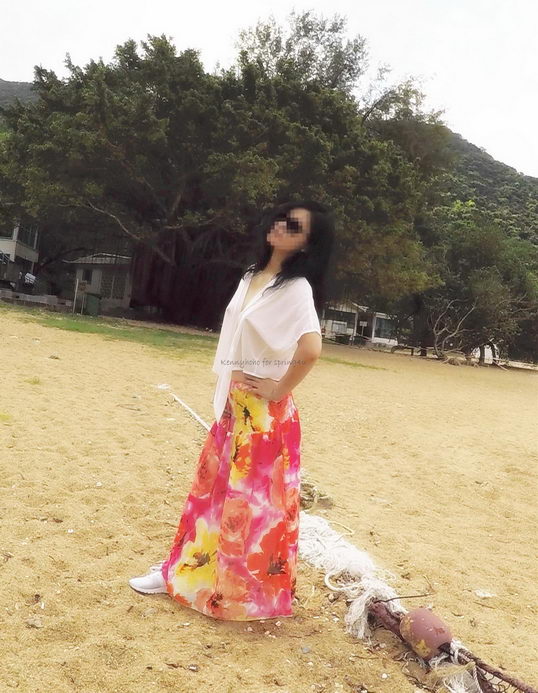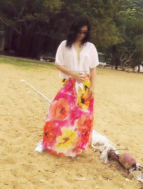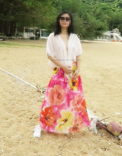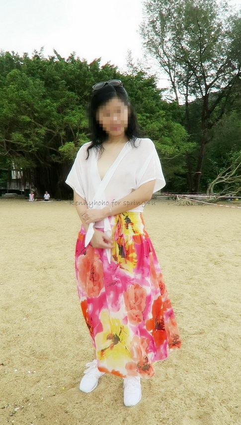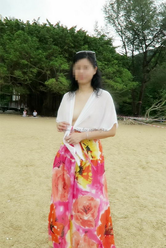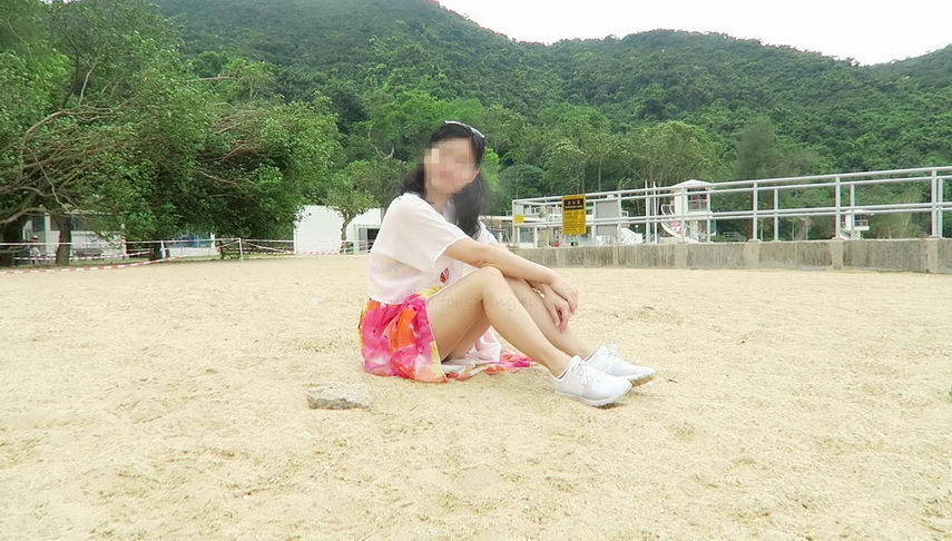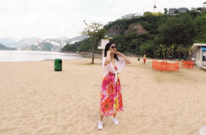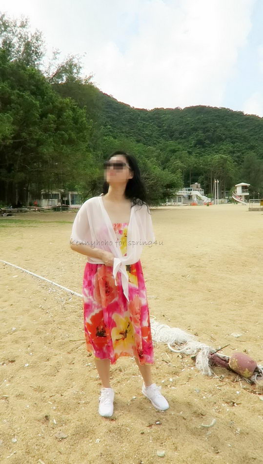 專為四合院買了 "一次性" 的拍照衣服, 到沙灘去. 已經挑了個人少的沙灘, 但仍有不少救生員和清潔工人, 還有一些日光浴者. 小菲很不習慣, 幸好裙子可以很方便的拉下來.