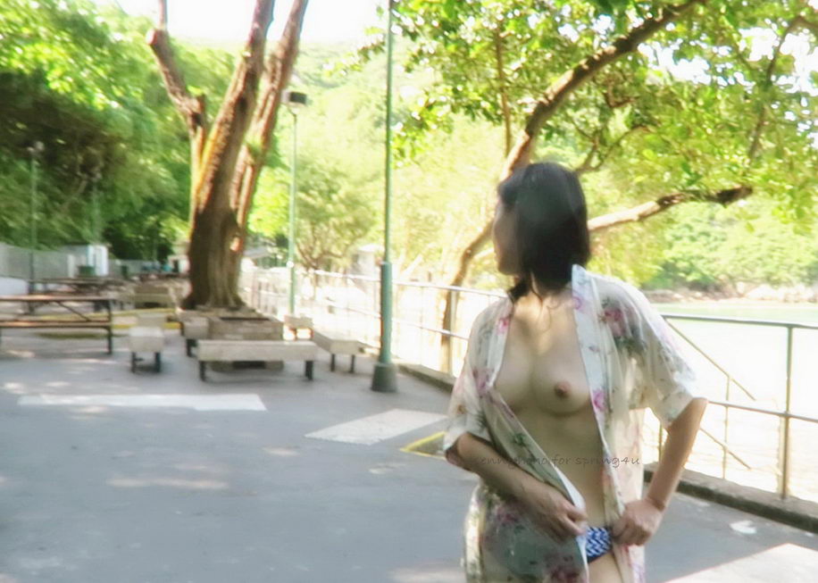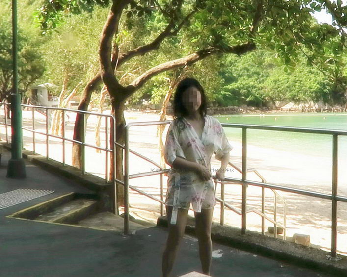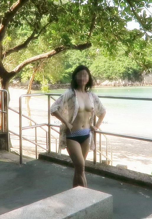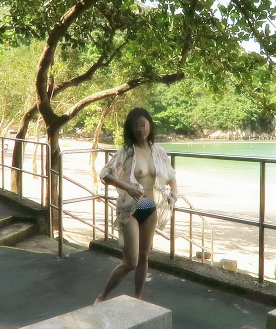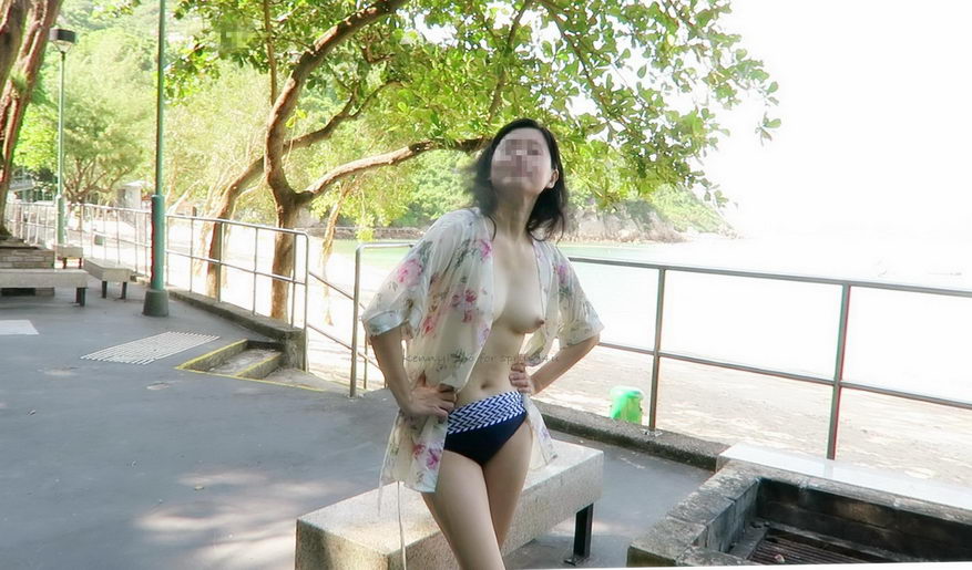 小菲把泳衣三點變一後, 由於有外衣遮掩, 倒也拍得自在. 不過, 背後還是有些泳客、救生員和清潔員工, 所以不時回頭張望. 事實上, 這些朋友應該知道我們在做什麽, 很有興趣多看兩眼.