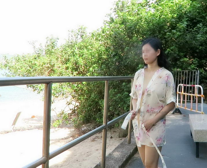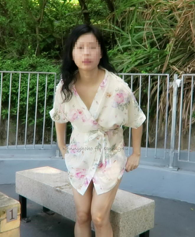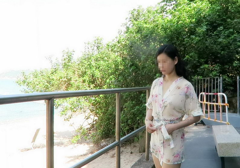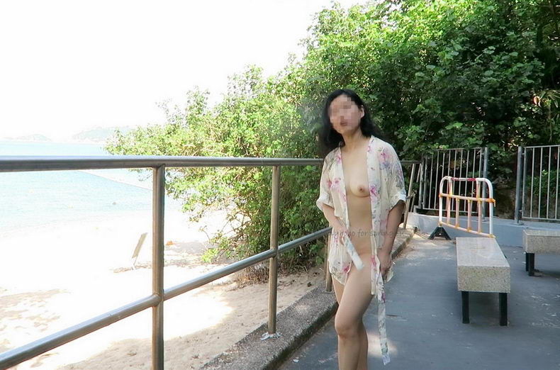 小菲倚欄享受清風, 一陣子後, 我試探的問, 在戶外沒試過全裸呢, 有外衣, 應該不違法. 小菲猶豫片刻, 即把三點式的下半截脫下, 也算是徹底清空了. 不過, 拍照的時候還是緊張, 不敢挺起胸膛.