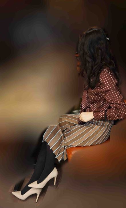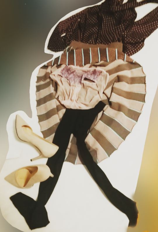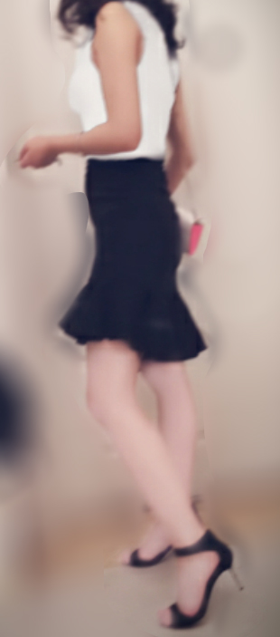 身穿白色襯衫,黑色西服套裙,腿上穿著淺色透明白絲襪、黑色細高跟,那天,