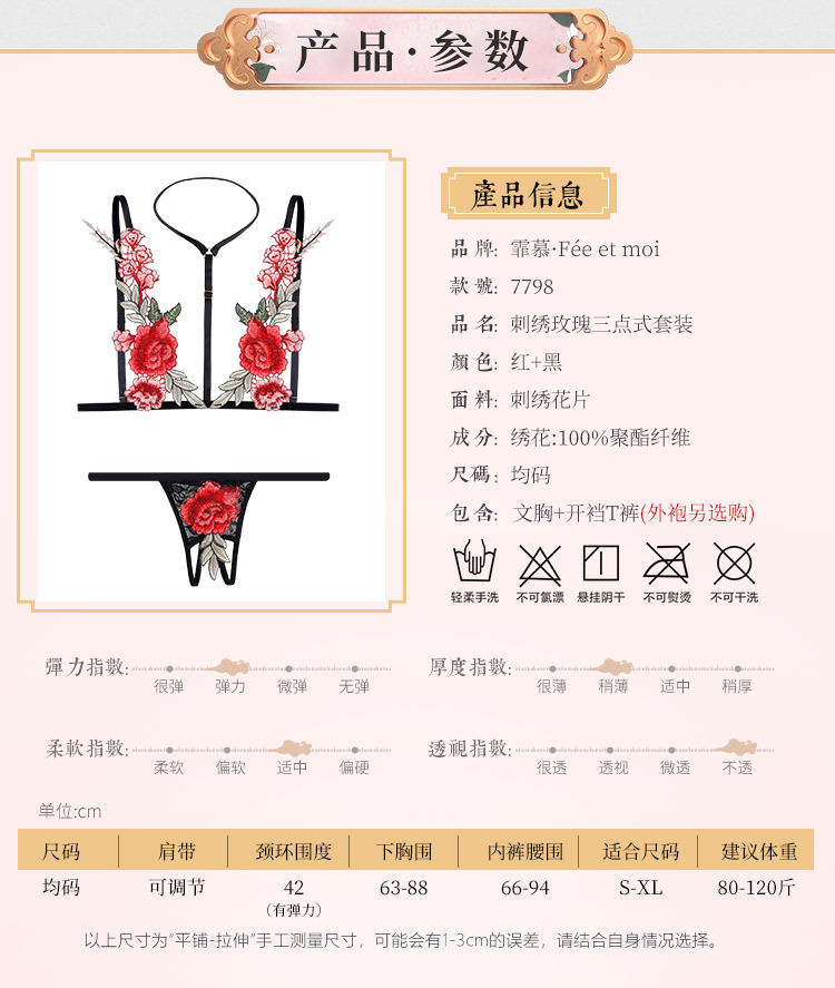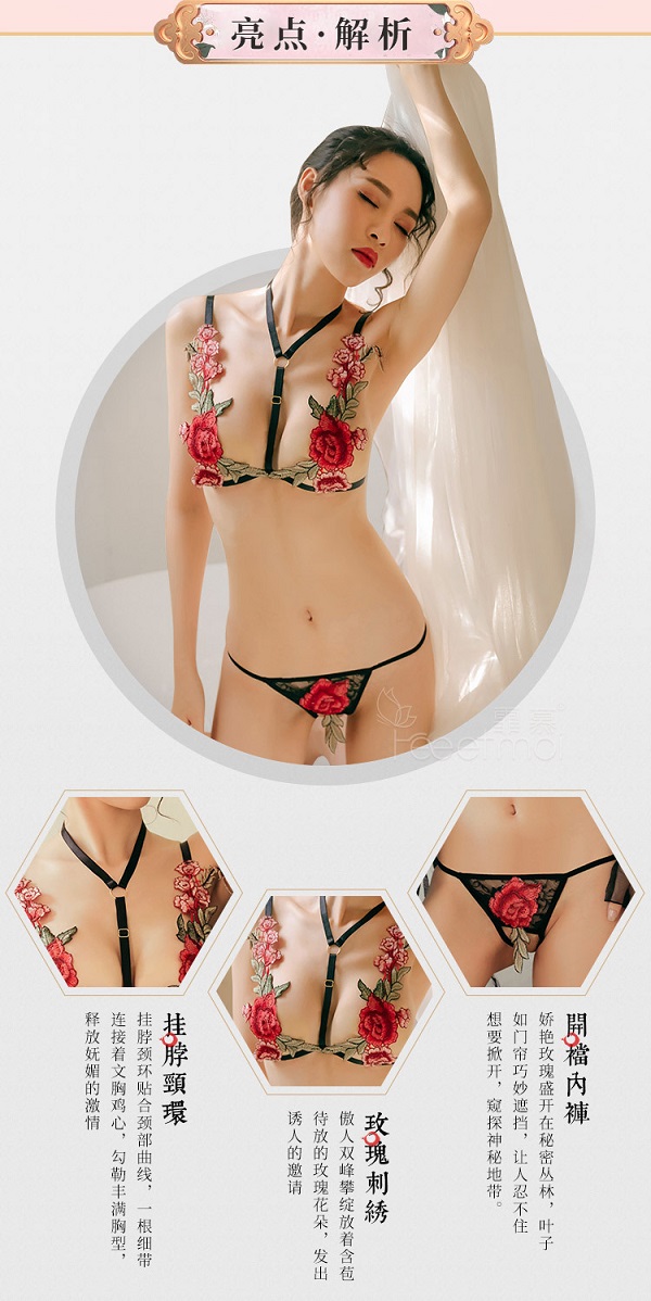 被三朵火紅玫瑰給包覆,花朵跟肩帶上裝飾著刺繡的蕾絲枝葉顯得無比魅惑誘人