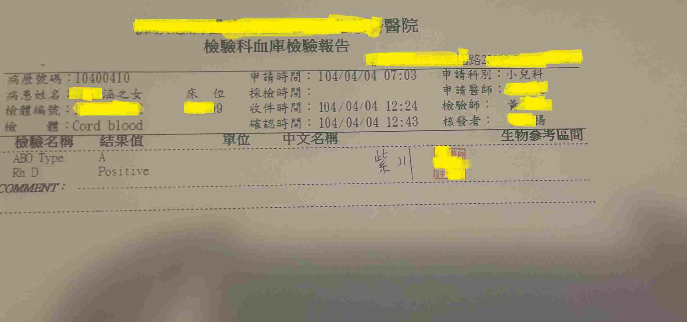 PS3. 這是當初表姐拿來的  聽說臍帶血比較不準(就是左上角寫cord blood那邊)  不過後來再驗一次也是A型
