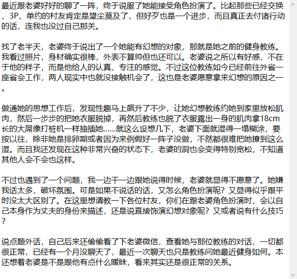 最近跟老婆好好的聊了一阵,终于说服了她能接受角色扮演了。比起那些已经交换、3P、单约的村友肯定是望尘莫及了,但好歹也是一个进步,而且真正去付诸行动的话,连我也没过自己那关。找了老半天,老婆终于说出了一个她能有幻想的对象,那就是她之前的健身教练。我看过照片,身材确实很棒,外表不算帅但也还可以。老婆说之所以有好感,不在于他的