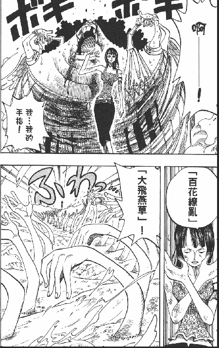「B99・W59・H89……原來你們也想奪得阿拉巴斯坦!放了我!我可以說動社長跟你們合作!」羅賓忍住全身上下不自在的感覺,依舊想要替自已尋得機會逃離。