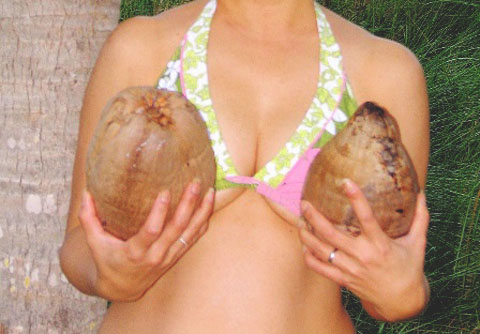 從圖片中大椰子殼的後面隱約透露出的比基尼可看出