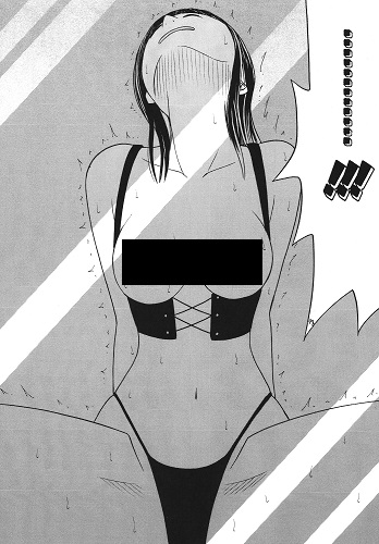就在羅賓三點失守浪叫連連時,緩慢光線又照到了她的身上,羅賓表情經歷了 享受->困惑->恐懼 的快速轉變。羅賓的時間又一次“靜止”了,且充斥全身的快感不但沒有消失,反而因緩慢光線的原因而沒有絲毫減退,但是作為快感來源的性感帶卻無論如何也得不到被愛撫的感覺。三個海盜開始愈發激烈的攪動他們的唇舌,吸溜噗嗦的淫蕩聲響不絕於耳,羅賓本就被潤滑油塗的發亮的肌膚上又混入了海盜腥臭的唾液,整個場景變得更加淫靡。被架在半空的女體承受著半吊子的快感而備受煎熬,但是30秒後解放帶來的快感總攻直教人不寒而慄,既希望高潮,又不敢高潮,羅賓站在了一個兩邊都是深淵的懸崖之上,不知所措。