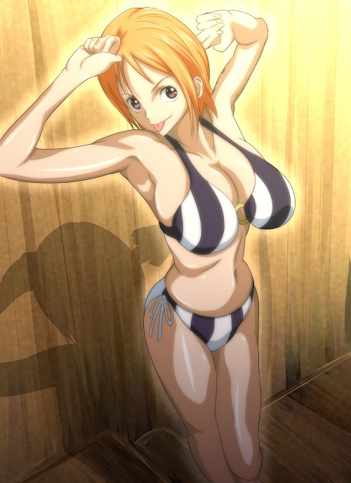此時的娜美身上只穿著一身黑白條紋的比基尼,青春性感的嬌軀被前後左右的觀眾一覽無遺,挺翹的屁股和雄偉的胸部更是如吸鐵石一般牢牢的抓住了所有人的目光,就連她的同伴草帽一夥也不例外:山治已經眼冒桃心,鼻血直流,眼看就要過度性奮而被石化了,平素節制禁欲的索隆也忍不住臉紅了起來,只有心智純潔的喬巴和路飛兩人,大聲的給同伴打氣:“娜美、烏索普,你們兩個要把‘狐狸頭’他們打飛,把羅賓救回來哦!!!”