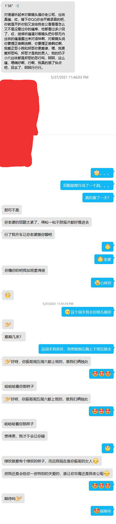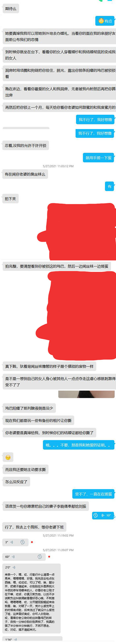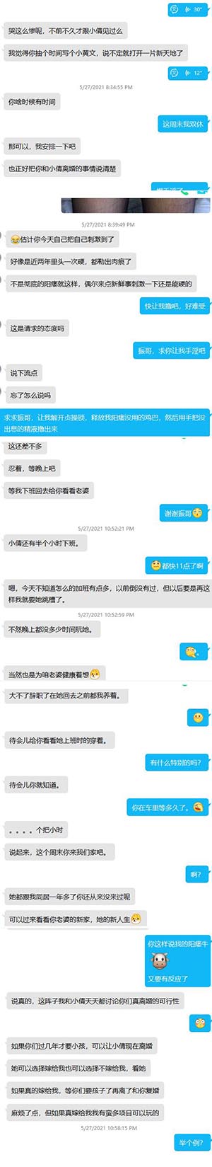 然後重點來了,自從認識振哥後我們之間保持了一種比較特別的交流方式,振哥住的地方開車大概5個小時,高鐵2小時,說遠不遠,平時我們都沒休假時會在微信或者QQ上碼字交流,然後他會主導,讓我一點點的說出自己對綠帽的性幻想,等有時間見面時再去有選擇的嘗試,說真的有一種很奇怪的快感,從一開始的比較淺層面的清淡的到後來特別不現實的。前面的幾乎都實現了,而後面的部分實現了。其中有一條幻想就是我老婆的身心都被他奪走,跟我離婚後嫁給他,而我孤苦伶仃的一個人,失去一切,只能用老婆的絲襪對著他們的性愛自拍手淫。