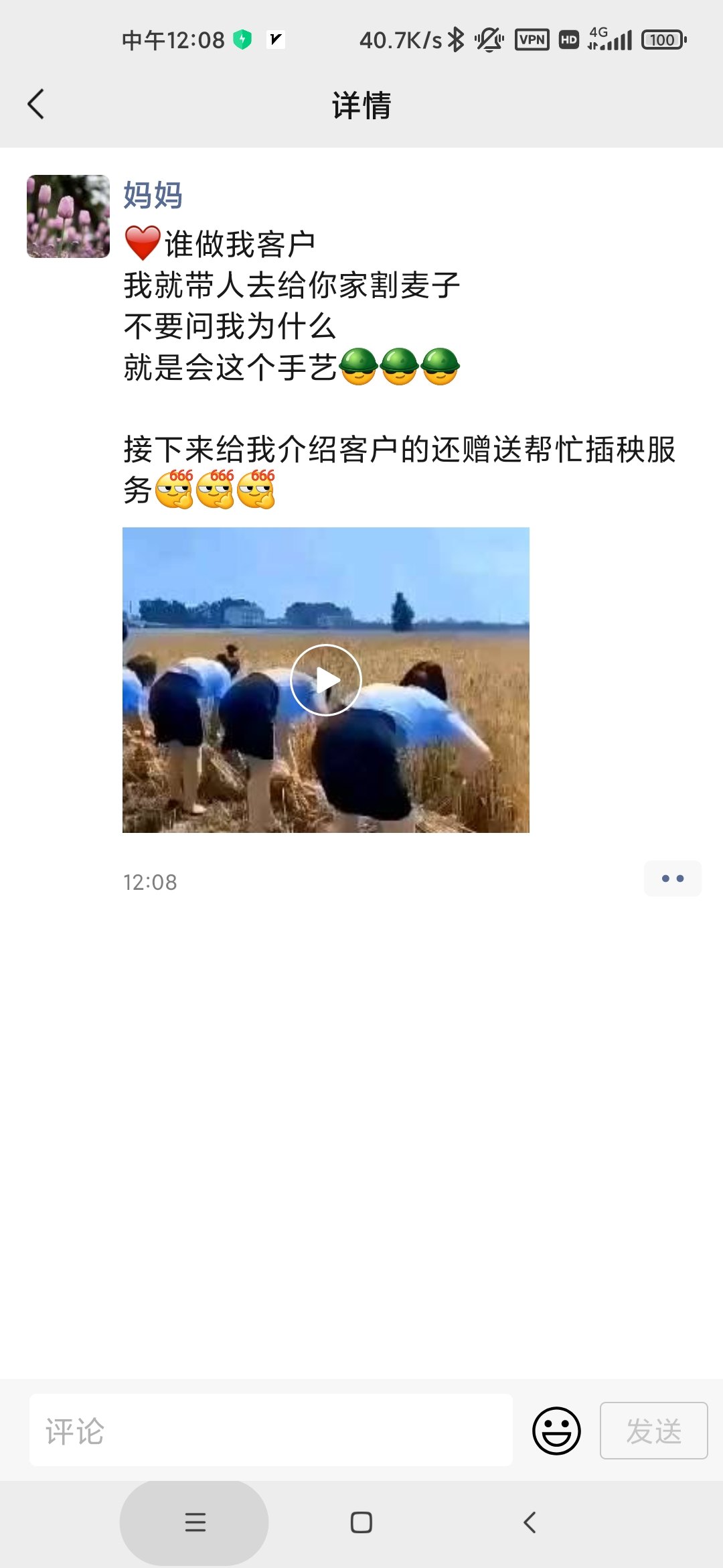 吼吼,刚打开微信刷下朋友圈一下就被妈妈这条朋友圈吸引了,什么是插秧,插哪里呢,怕是妈妈转发时候压根没有考虑到这个插的深层次意思吧。哈哈。那不如给妈妈介绍个野男人好好享受下大鸡吧开垦插秧的快感啊。