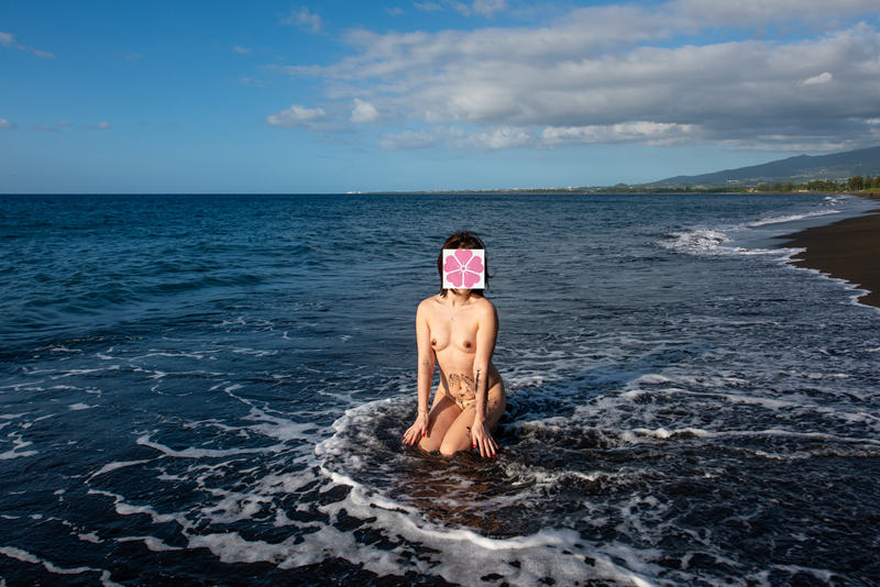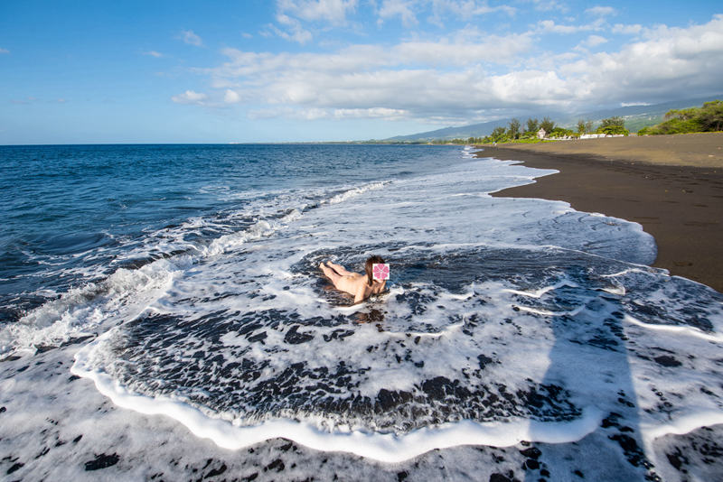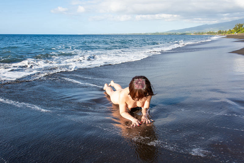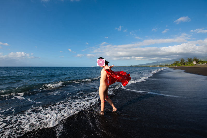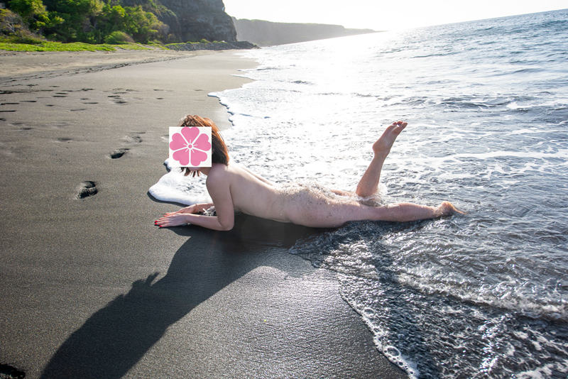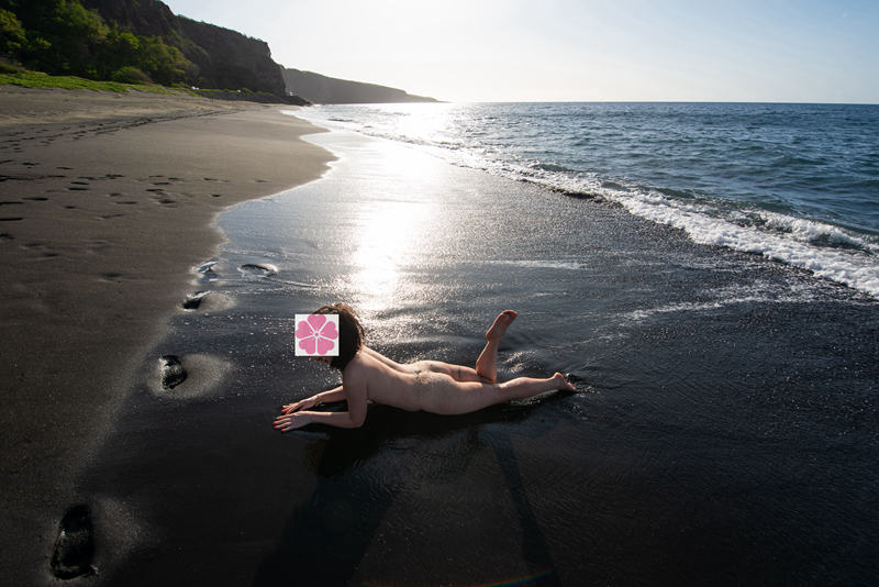 黑色的沙灘與白嫩的肌膚形成讓人慾火焚身的對比
