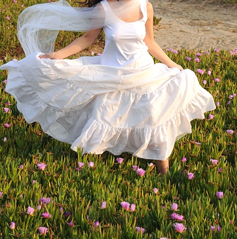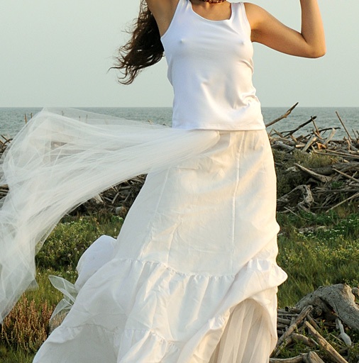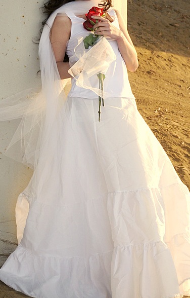 色的Top和白色的長裙,外加一束白紗,算是簡單的新娘禮服。