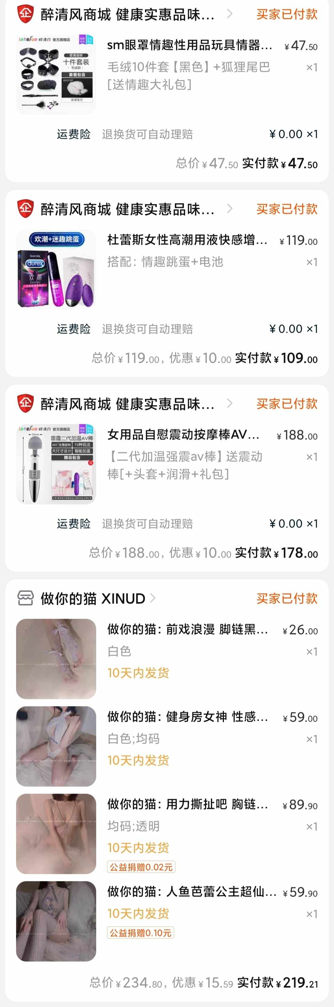 刚下单的几件情趣衣物,跳单,震动棒,高潮液,正好老婆这周来大姨妈,嗯,东西周天也到,下周抽个时间好好玩她一下,争取拍一套大片出来。