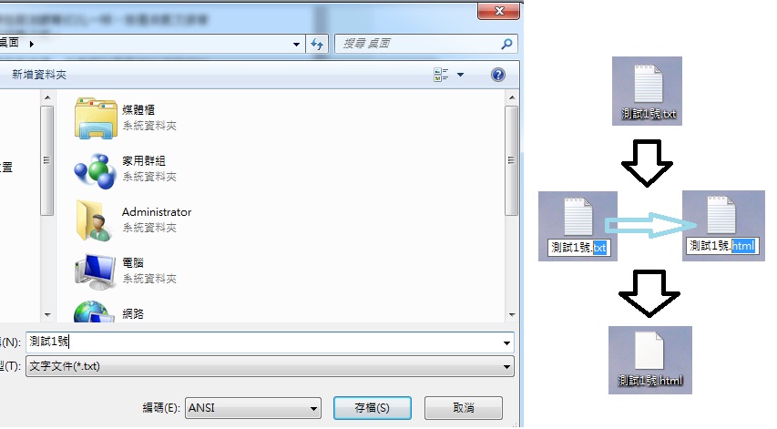 4.把純文字文件檔案.TXT的TXT檔名換成HTML 之後確認存檔