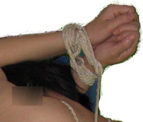 雙手背綁是常用姿勢。先用棉繩在她一隻手腕上纏幾道綁緊打結,將她雙手