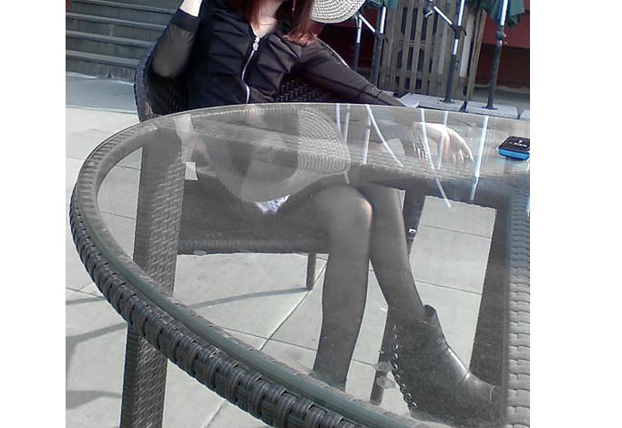 面的美腿絲襪,穿著短裙和性感的肉色絲襪,右腿提起頂住桌下,左腿自然的伸