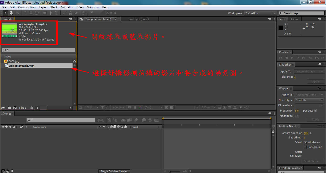 1.開啟After Effects選取要合成的影片和場景匯入並且觀看影片長度和大小。如圖1