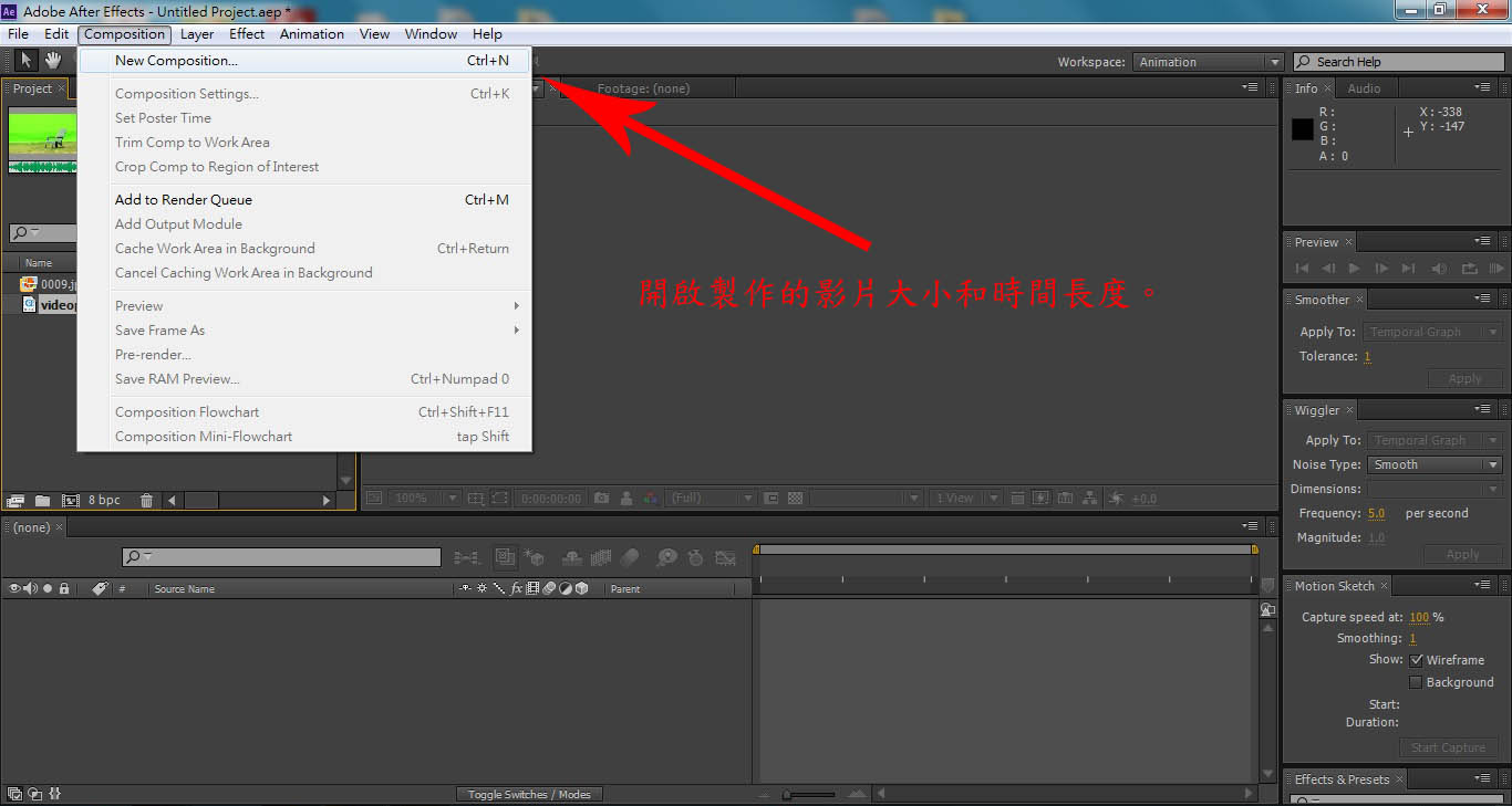 2.選擇composition→new composition設定影片大小和長度。如圖2
