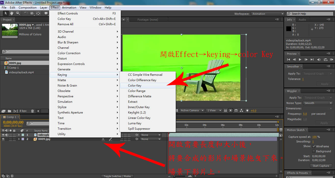 在綠幕影片開啟Effect→keying→color Key啟用去背特效。如圖3