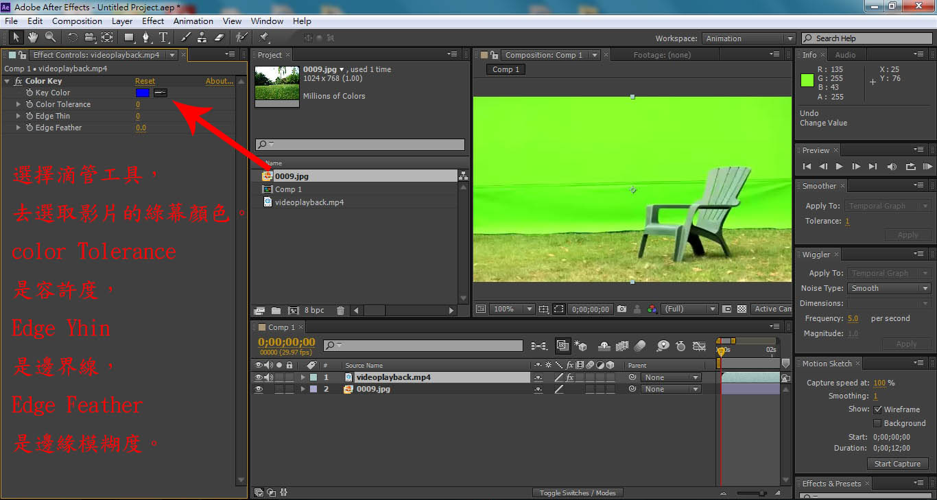 4.選擇滴管工具,去選取影片的綠幕顏色。color Tolerance是容許度,Edge Yhin是邊界線,Edge Feather是邊緣模糊度。