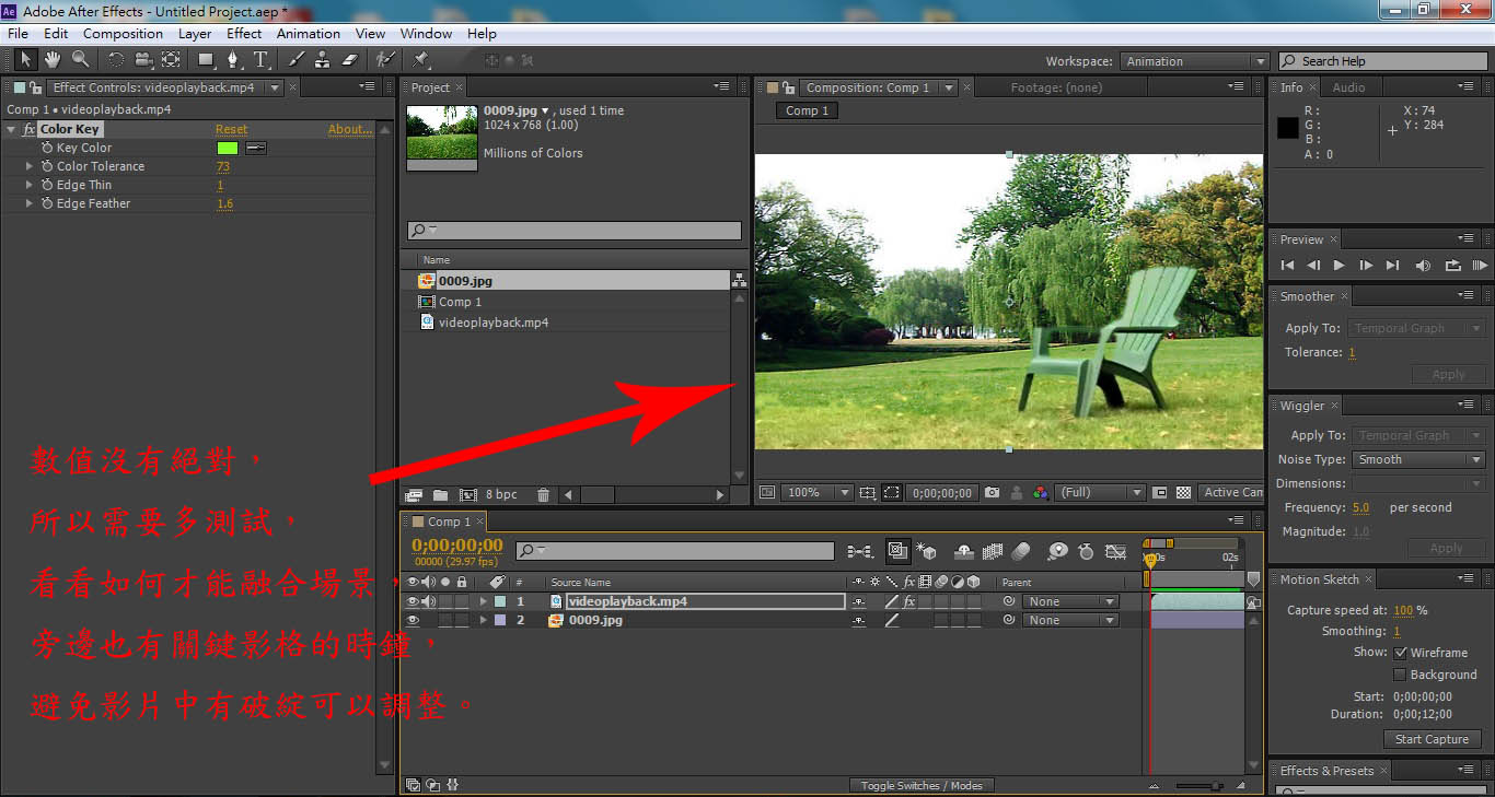 5.調整數值,數值沒有絕對,所以需要多測試,看看如何才能融合場景,旁邊也有關鍵影格的時鐘,避免影片中有破綻可以調整。