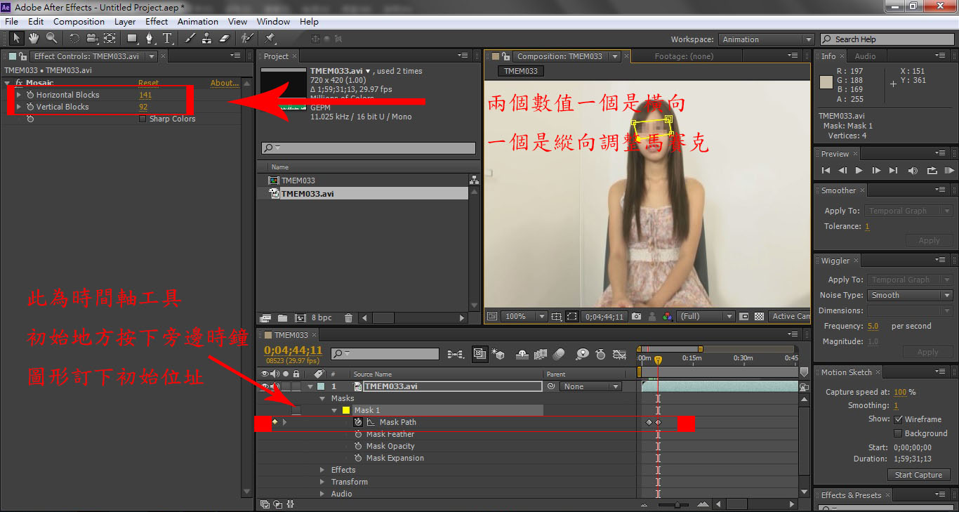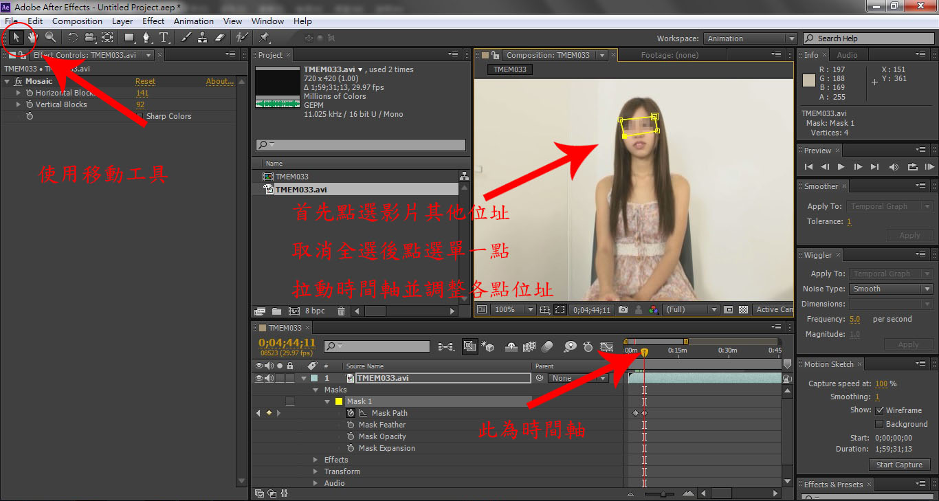 時間軸的定位點是為了可以移動遮色片效果,避免影片中途跑出馬賽克範圍,