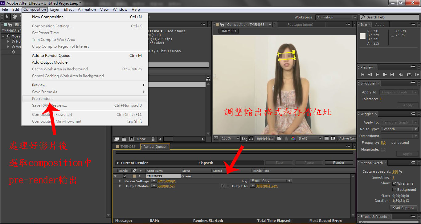 7.影片處理完畢後,選取composition中pre-render輸出影片,輸出面板中可選取
