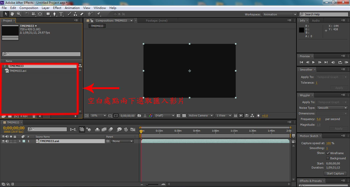 1.首先開啟Adobe After Effects,在(圖一)圈選空白處點兩下選擇需要匯入處理的影片。