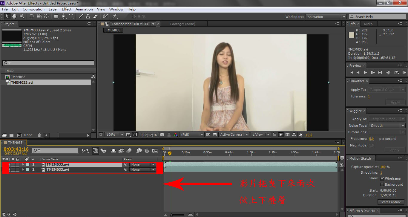 PS:由於無法確定拍攝者攝影畫數為何,所以建議直接拖曳下去當一個comp,一般DVD為720*486、HD為1280*1080,