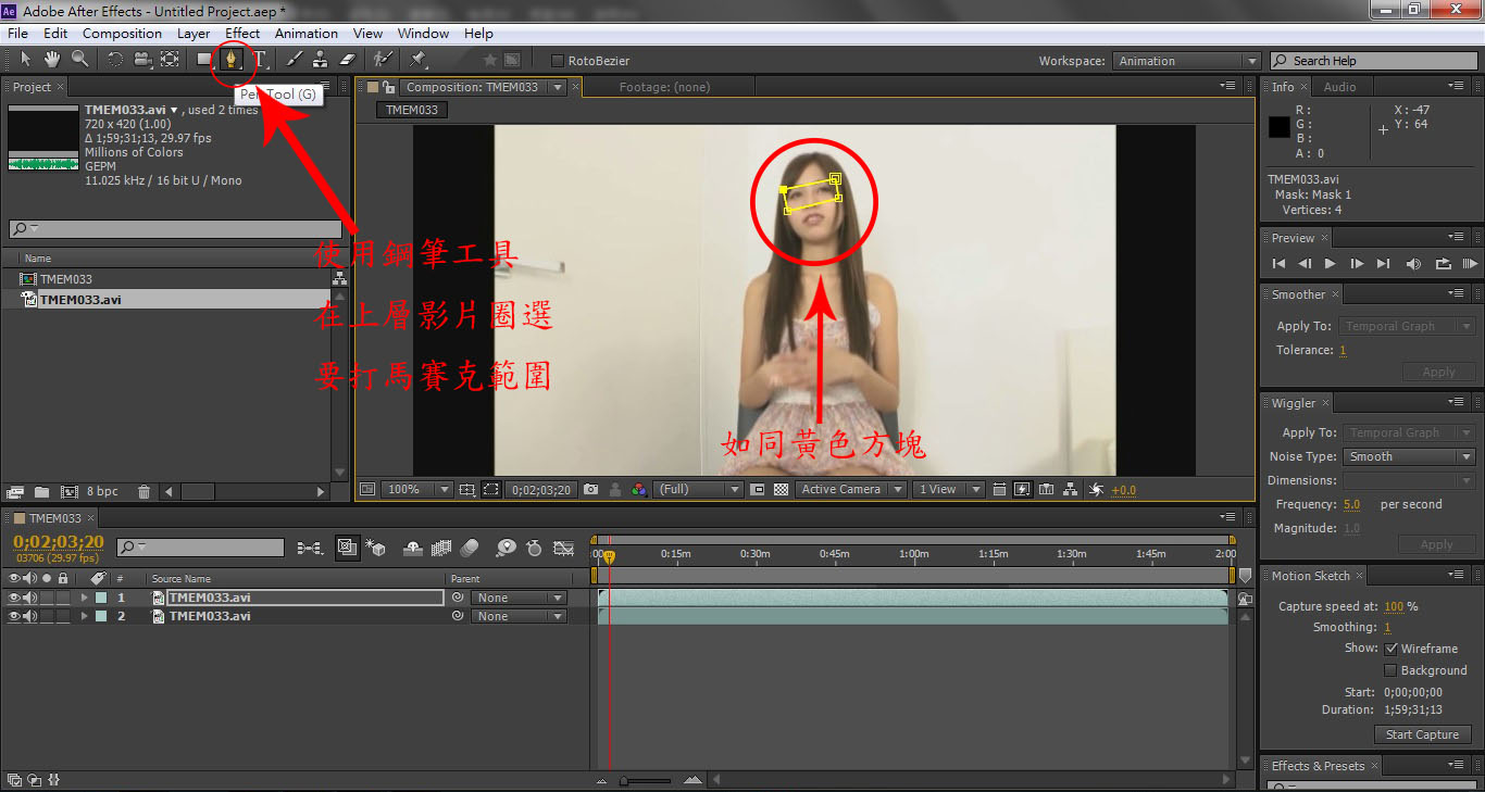 3.使用鋼筆工具,在於上層影片圈選需要打馬賽克範圍,如(圖三)。