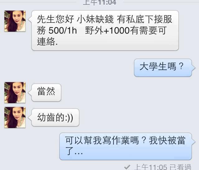原來是可以做這種事情(寫作業)的呀!? 難怪要”大學生”了…野外+1000…搞不好還有碩士畢業生呢。原來外面的行情價真的是一小時500喔,我一直錯怪那兩個惹。