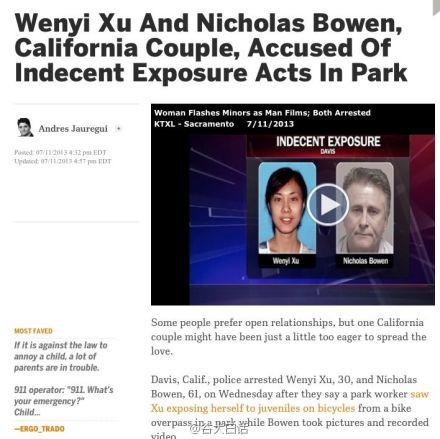 有位美国华裔少妇,这个心理啊就特别玄妙。这位名叫Wenyi Xu的30岁女子和她的61岁男友被警方逮捕。原因是这位女子在公园里见到有路过的单车少年就脱光衣服,然后男友在旁边用手机拍摄……警方称,其中一名受害少年从单车上掉了下来,但幸好没有受伤。