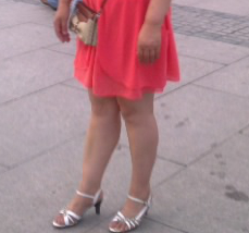 一條橘紅色的短連衣裙,肉色薄絲襪,黑色高跟皮鞋。這件連衣裙是不久前我陪