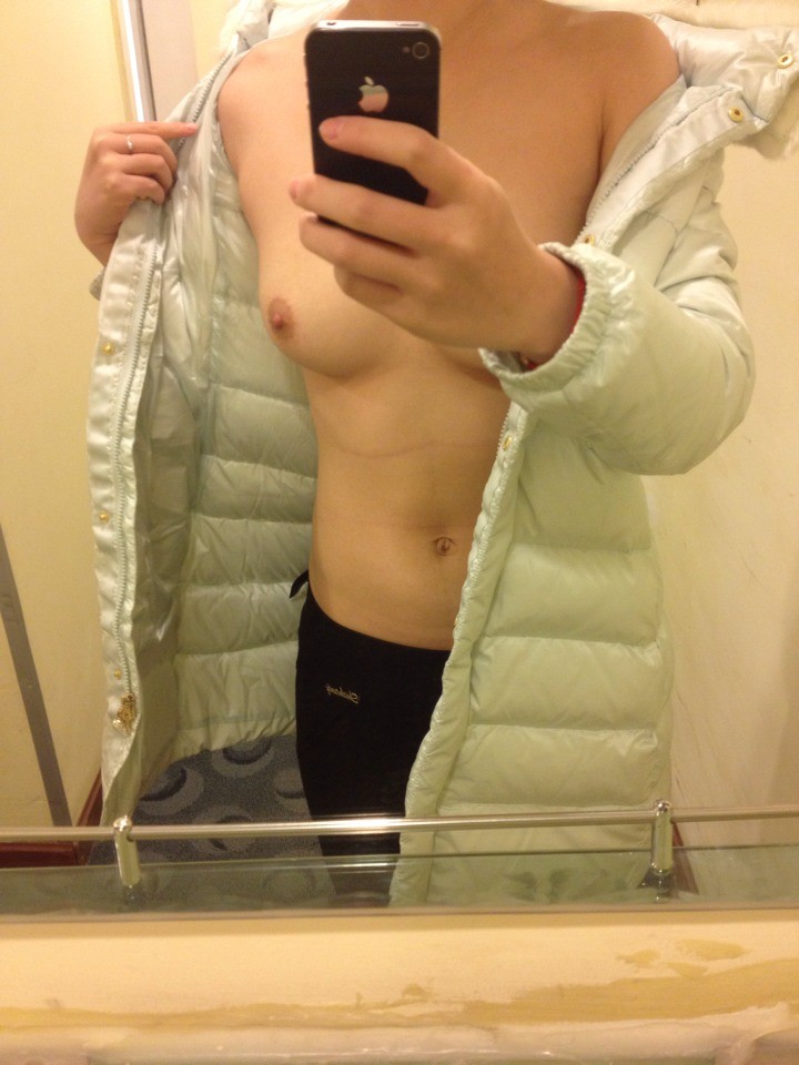 这两天陪同学考研,白天没事就想玩自拍。。。本来都是上身真空的走到街上了,无奈车来人往,实在没有勇气,就在酒店的走廊和房间自拍了几张。。。由于是自拍的,所以效果不大好哈