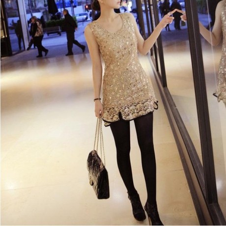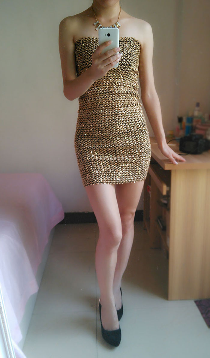 耀眼的金色緊身短裙和同樣炫目的金色高跟鞋,這次還搭配上了不純粹的黑色絲