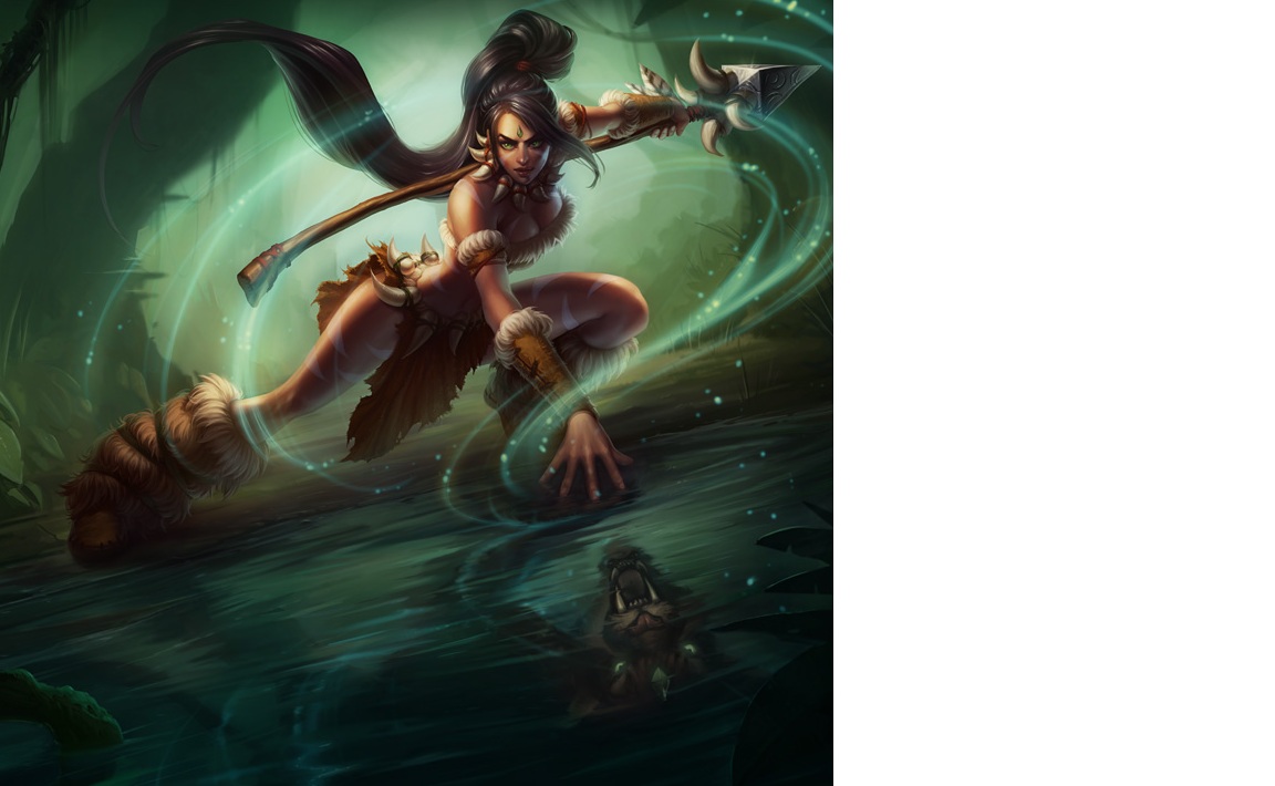 奈德丽只是一个年轻的姑娘,在很小的时候,随着寻宝的父母一起迷失在这片茂密的雨林中。丛林是无情的,她眼睁睁地看着自己的父母染上莫名的恶疾在痛苦与煎熬中死去。就是在这样恶劣的环境中,奈德丽奇迹般地生存了下来。由于她天真无邪,童稚可人,丛林中的野兽都很喜欢她。更幸运的是,居住其中的美洲狮一家将她当作自己的亲人般抚养。奈德丽渐渐长大了,并不知不觉地吸收着茂密丛林的魔法原力,她的进化超越了人类和猫科的本能。在她生命中最重要的一天,奈德丽站在诺克萨斯伐木队被摧毁的营址上,选择重新回到文明世界,加入英雄联盟作战,保护德玛西亚和诺克萨斯的广袤丛林。