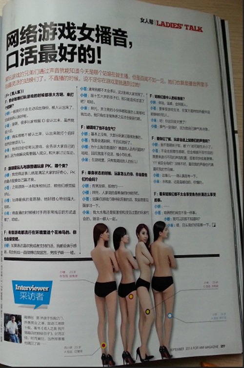 看了大大这篇文章,我还专门去搜了一下原帖,看了一下具体的访谈,结果发现大大的想象力很丰富啊,几乎发现了每段对话可以开发的部分,也将这几个主播装纯装嗲的形象刻画出来,黄导跟小甜的对话真是很精彩啊,通过黄导的讲述又有许多让人兴奋得故事,比如『我大水瓶还是挺害怕和没见过面的玩家约会的,除非一群人一起。』大大竟然开发出新婚少妇粉丝见面发展成轮奸这种无比刺激的故事,虽然从某些对话内容看起来大大的想象力有些天马星空,但其实大大完全把这几位“美女”解说装纯卖骚的气质体现出来,比如原访谈『看来姑娘们都不太会享受角色扮演这么享受的事。』,小苍回的是『咱俩想的肯定不是一回事。』小米(应该就是文中果子妈)回的是『嗯,我好好观察下。』都是给人留有幻想的可能,看似很纯的回答,又实际上是在引诱看访谈的人采取另一种理解,还有更明显的就是大大也提到过的『要享受游戏生活,在某方面特别热爱并且能够做好的人。』似乎又是说对性特别热爱而且能够做好(哈哈,也可能是小弟脑洞太大),整个访谈就是一个猥琐的采访者,和四个装纯卖骚的人的互炒作,最后再配上一个“网络游戏女播音 口活最好的!”的大标题,就是给这群低俗,炒作无下限的最合适的一个标题