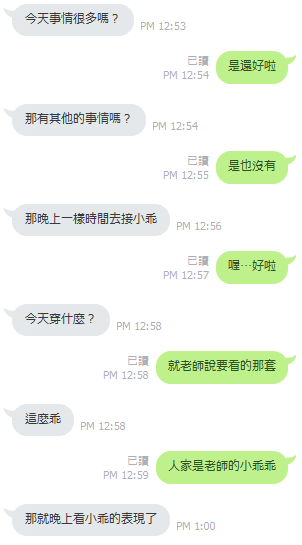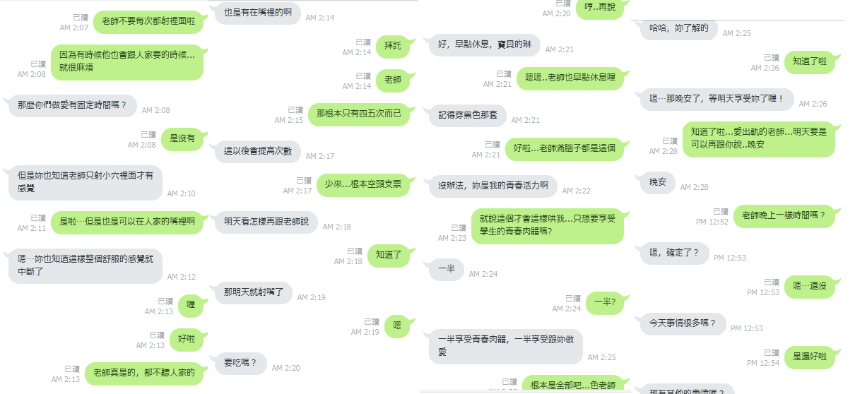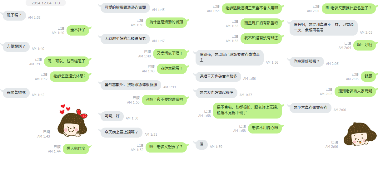 而現階段看對話也知道女友都很順從老師的意思,對話中雖然有一些露骨的成分,不過講得都很簡單,相信女友跟老師之間相處上有一定的默契,